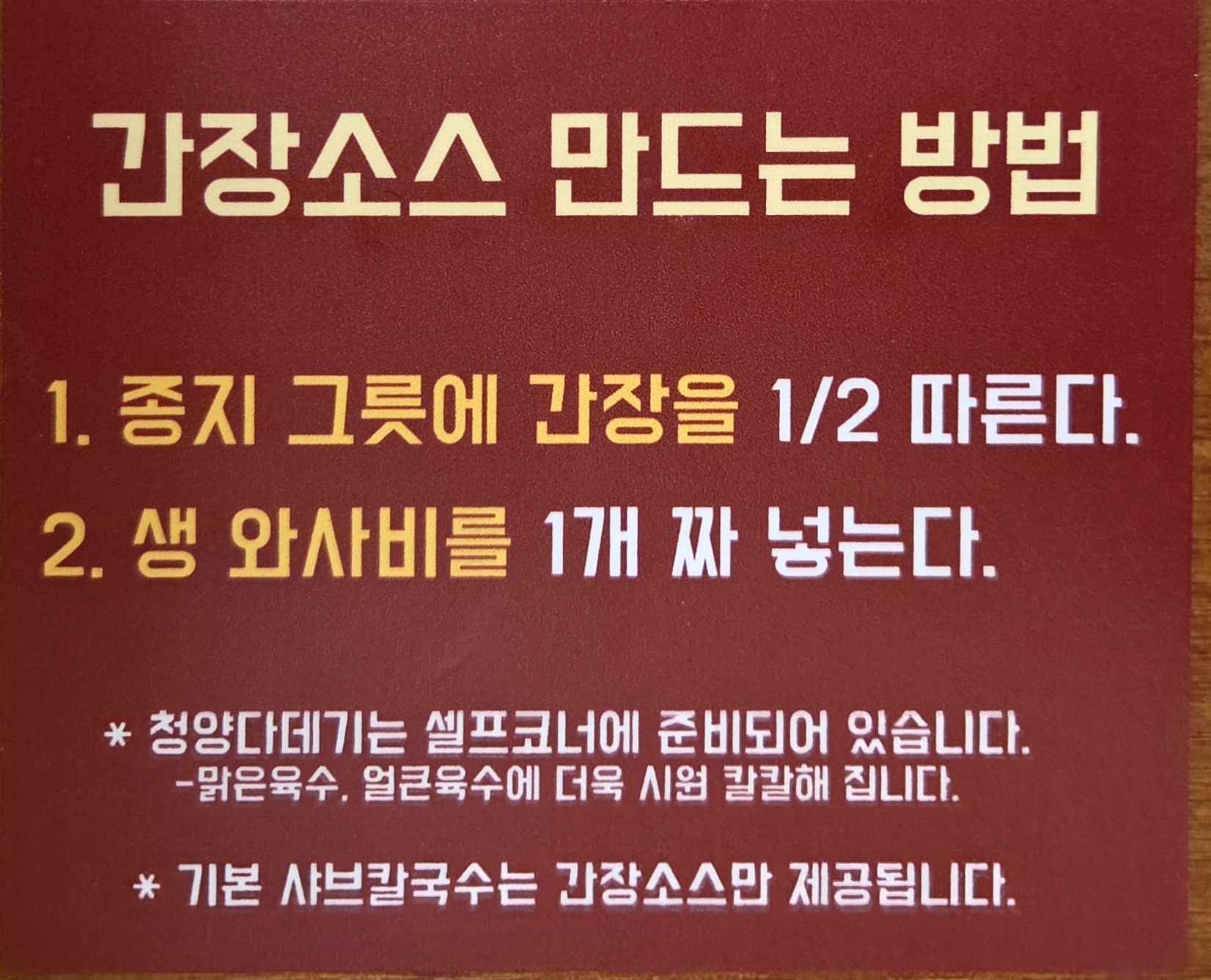 - 청양 다데기는 셀프코너에 있음 → 맑은/얼큰 육수에 넣으면 시원 칼칼해짐 💦